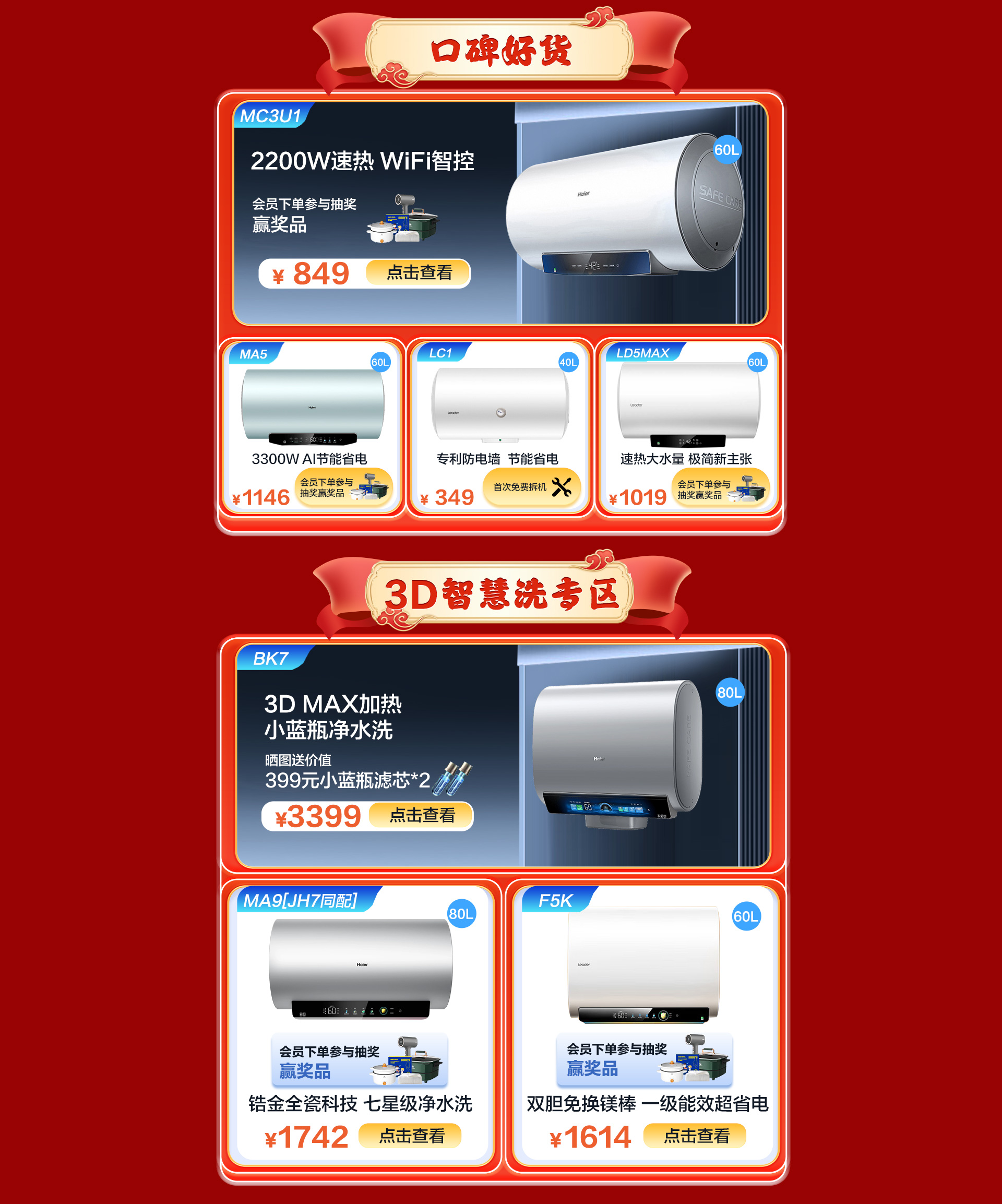 [TOP热卖]Haier/海尔60升电热水器家用卫生间储水式 EC6001-MC3U1 一级能效 WIFI智控 大屏数显